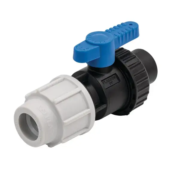 Vanne en PPH à boisseau sphérique - Embouts à compression Plasson et taraudé ISO7-1 pour systèmes de canalisations en PEHD sous pression.