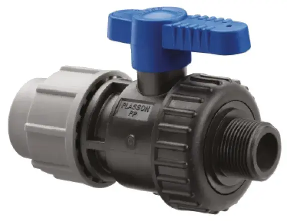 Vanne en PPH à boisseau sphérique - Embouts à compression Plasson et fileté ISO7-1 pour systèmes de canalisations en PEHD sous pression.