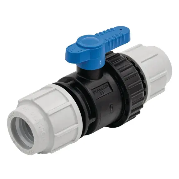Vanne en PPH à boisseau sphérique - Embouts à compression Plasson pour systèmes de canalisations en PEHD sous pression.