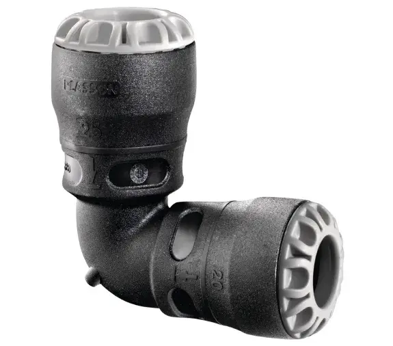 Raccord à encliqueter à 90° réduit pour systèmes de canalisations PEHD pression.