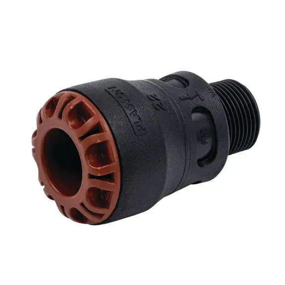 Permet l'assemblage droit d'un tube en cuivre avec un accessoire de réseau fileté selon ISO 7-1, de préférence en matériau plastique (type PP, PVC, PARV…).